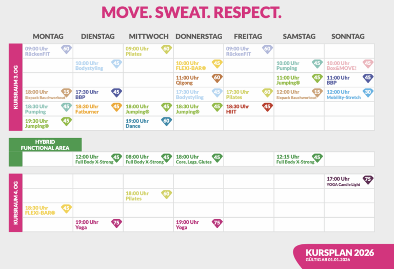 Von Klassikern wie Aerobic, Zumba und Bodystyling bis hin zu coolen Fitnesstrends wie Jumping Fitness oder Pumping. Hier findest Du unser umfangreiches Kursangebot mit täglich wechselnden Kursen.