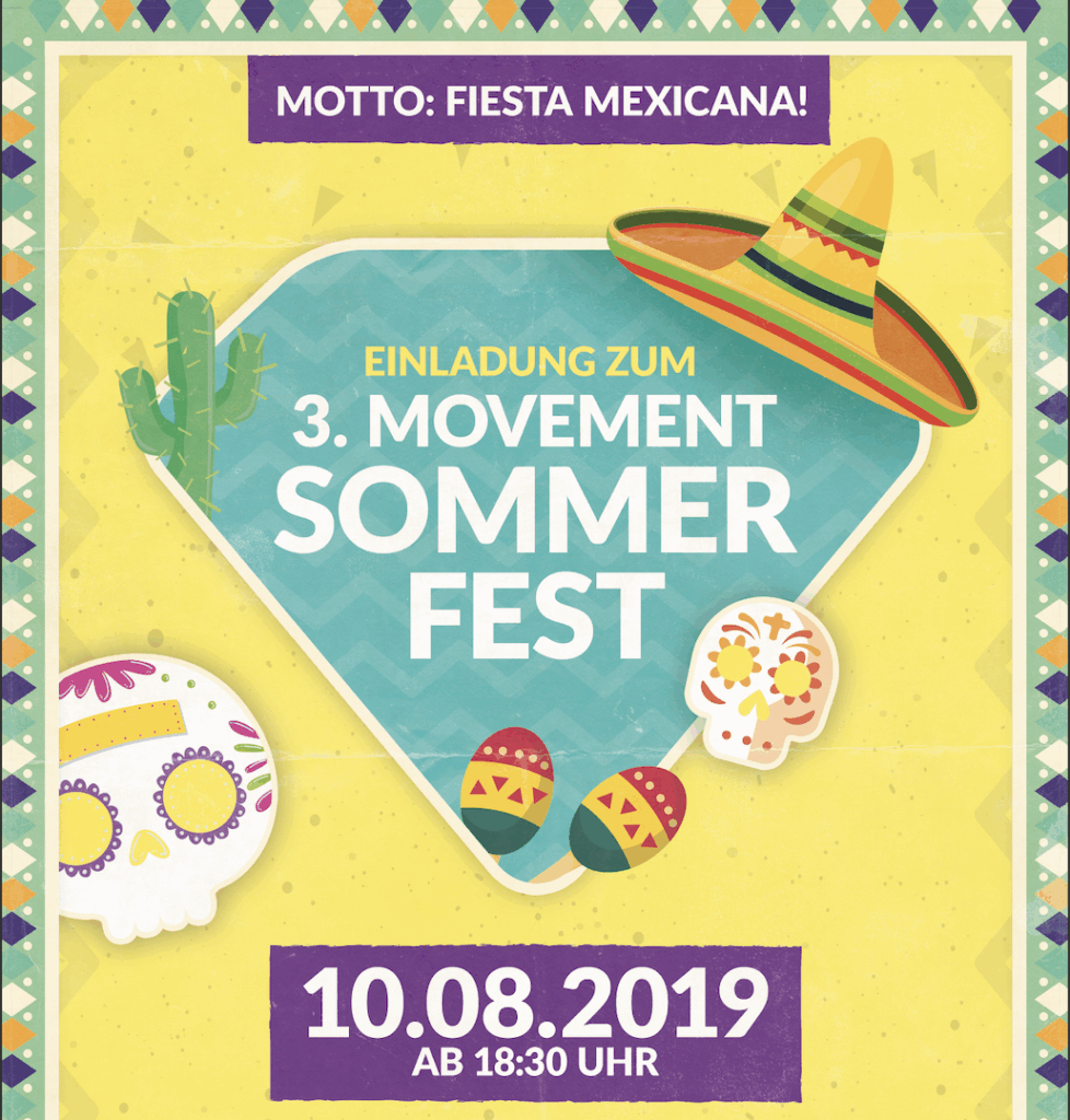 Wir laden alle Mitglieder und MOVEMENT Fitness Freunde zur großen Sommer Sause „FIESTA MEXICANA“ auf unsere Dachterrasse ein. Das Sommerfest steigt am 10.08.2019 und beginnt um 18:30 Uhr.