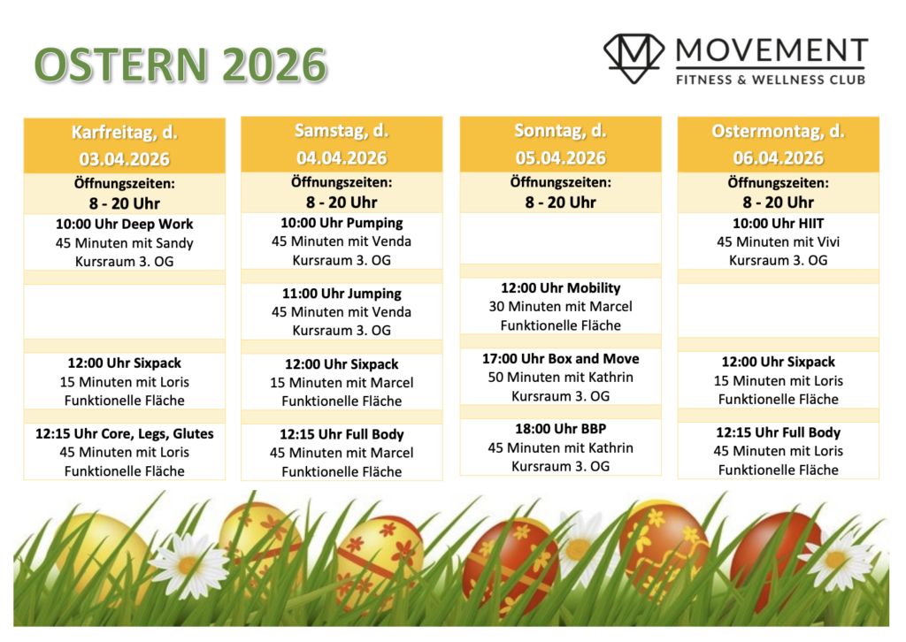 Ja, bei MOVEMENT Fitness & Wellness Club gibt es attraktive Probetrainings und Einstiegsmöglichkeiten, um die Fitnesskurse unverbindlich kennenzulernen. So können neue Mitglieder verschiedene Kurse testen, Trainer erleben und herausfinden, welches Training am besten zu ihren Zielen passt. Das Probetraining eignet sich ideal für alle, die ein hochwertiges Fitnessstudio in München suchen.