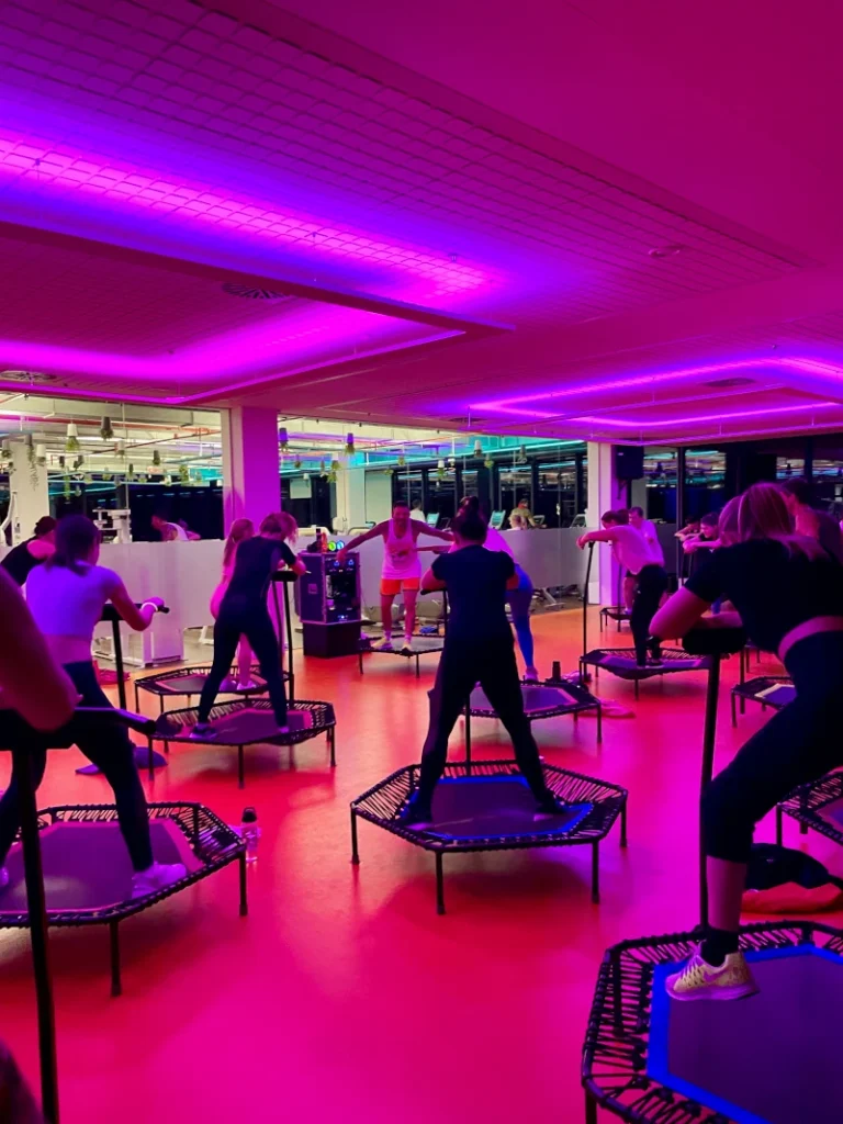 Unsere Jumping Fitness Kurse in München dauern etwa 60 Minuten und werden von ausgebildeten Jumping-Instructor:innen geleitet. Jede Einheit ist klar strukturiert: