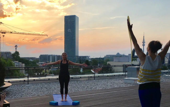 Wenn das Wetter mitspielt, finden unsere Yoga-Stunden unter freiem Himmel auf der Terrasse statt. Genieße die frische Luft, die Sonne und den Blick über München – ein besonderes Erlebnis für alle Sinne.